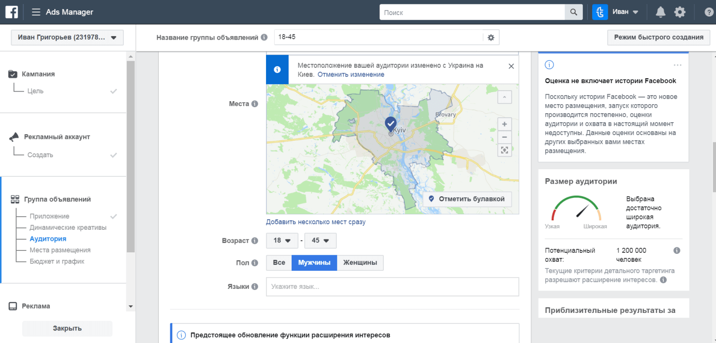 Это один из важнейших шагов в настройке рекламной кампании в Фейсбуке. Социальная сеть даёт огромное количество вариантов: