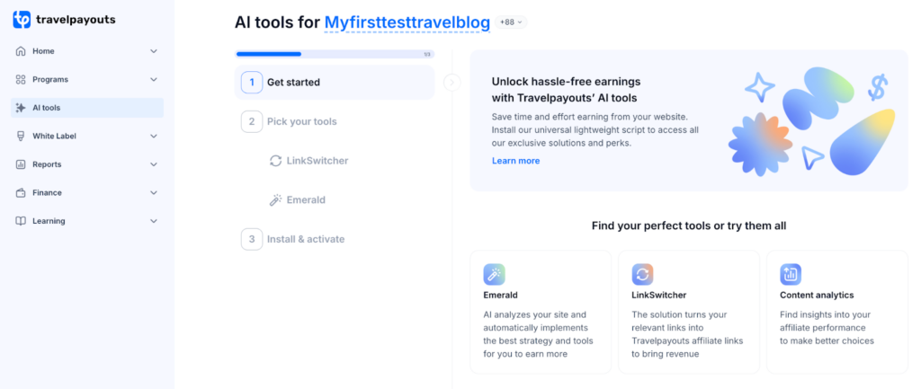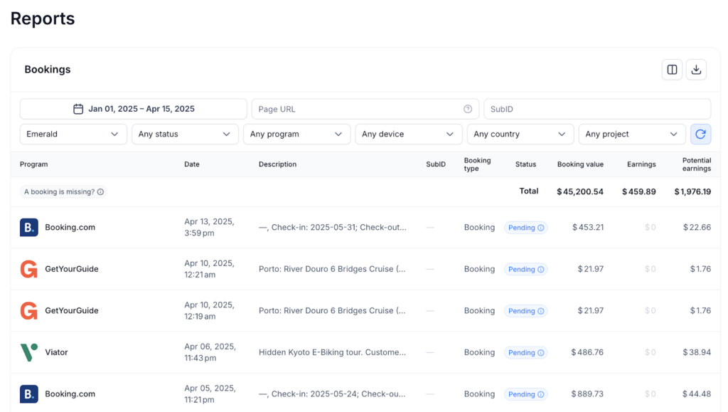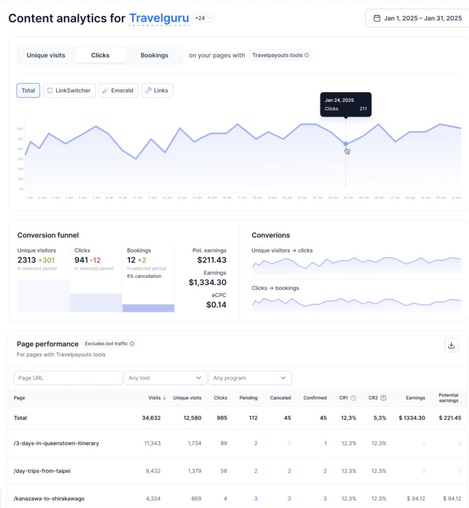 A single, easy-to-use dashboard shows which pages, tools, and affiliate programs are driving clicks, bookings, and revenue.