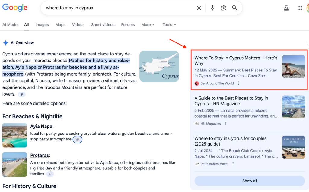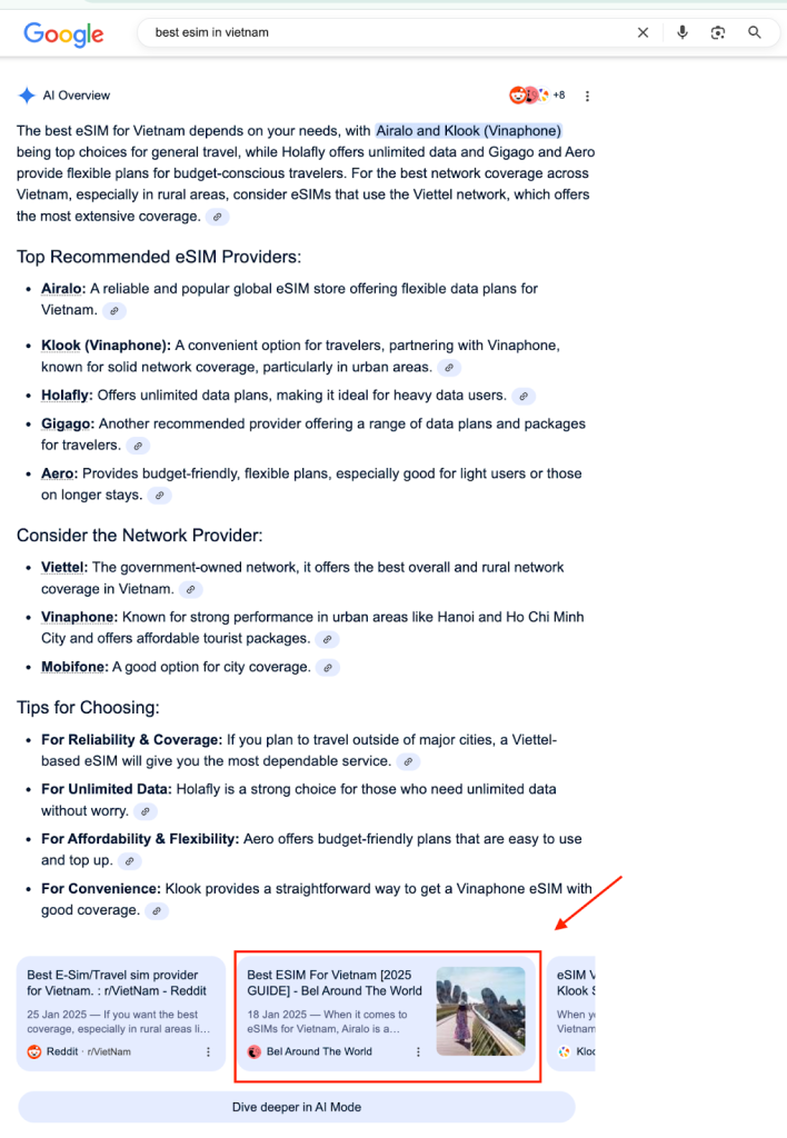 When I tested it for a few of my travel posts, I noticed snippets from well-structured blogs appearing directly in those summaries. That was my “aha” moment: SGE isn’t about eliminating blogs, it’s about selecting the clearest, most relevant sources to power Google’s summaries.