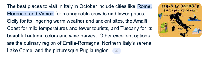 Picture this: someone types “best places to visit in Italy in October.” Instead of the classic page full of blue links, the first thing they see is a colourful box with a short, conversational summary.