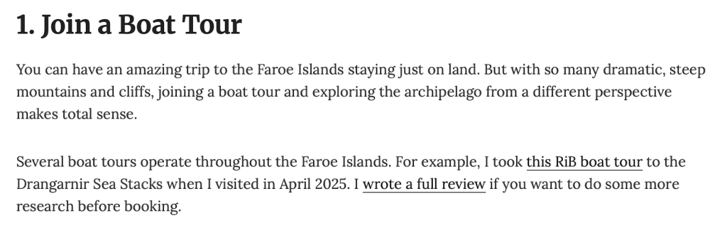 But he learned that conversions happen when links fit naturally into the story. Now, he places links only where they make contextual sense – like when describing a boat tour he personally took.