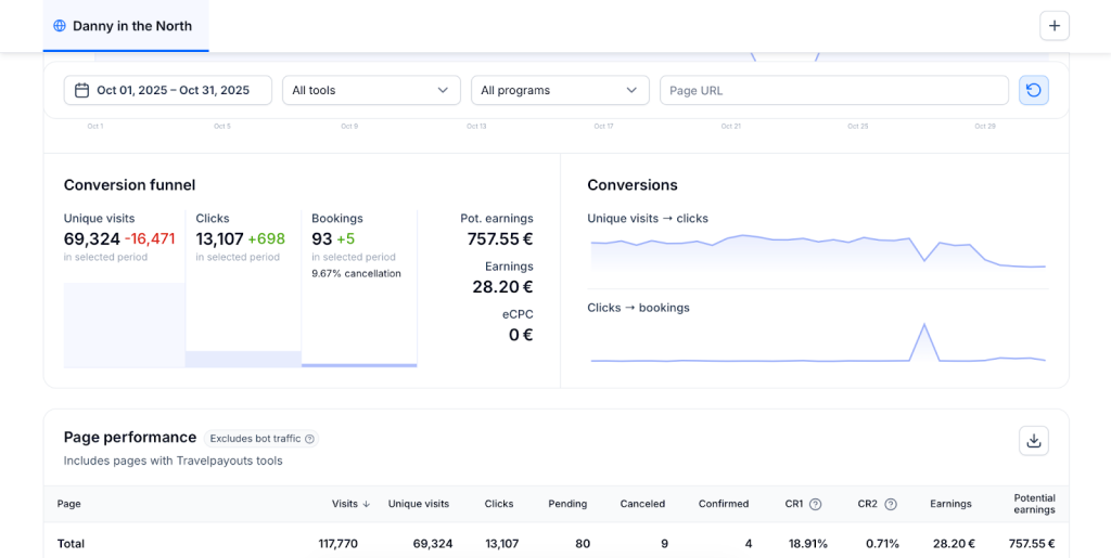 Danny uses Google Analytics and Travelpayouts Content Analytics monthly to track which articles and affiliate placements perform best.