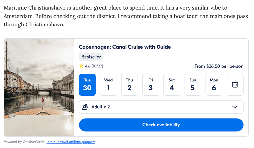When recommending a specific tour or experience, I use the calendar widget. Sometimes, giving readers multiple options makes more sense – and in these cases, I use multi-tour widgets. Besides being good for revenue, I like the aesthetic of these widgets in my articles.