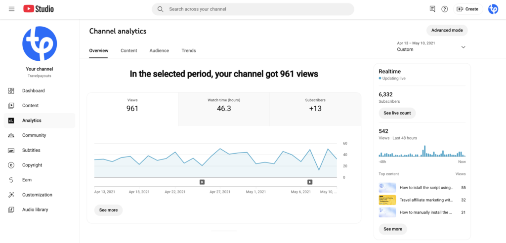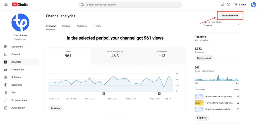 The first section that you’ll see in the dashboard is Overview. There, you’ll be able to see metrics such as views, watch time (hours), and subscribers for the selected date range, as well as your top videos. While it takes some time for Youtube Analytics to process the data, on the right you’ll see a real-time report for the same metrics.