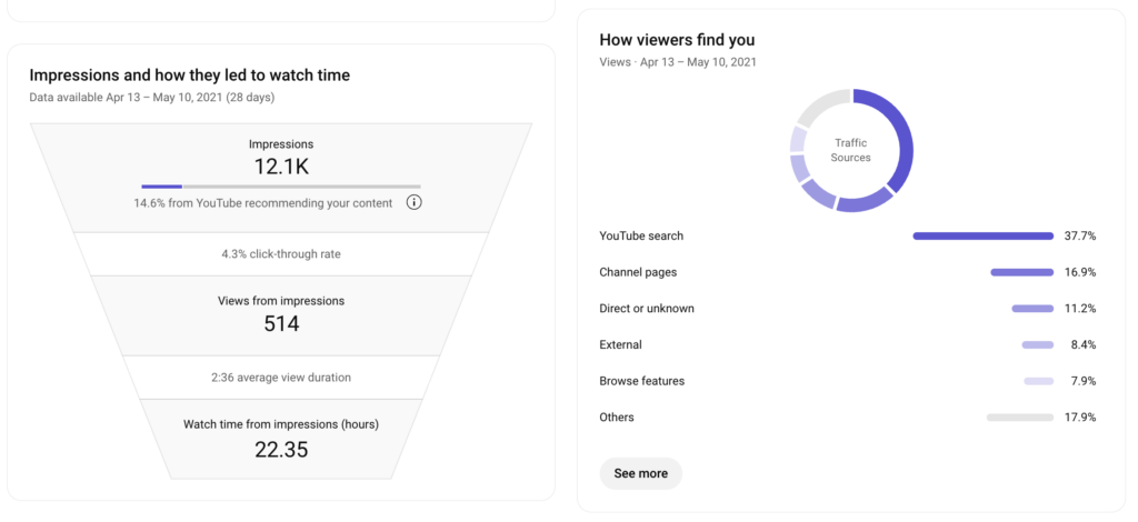 You’ll also see traffic source types and the relation of impressions to watch time.