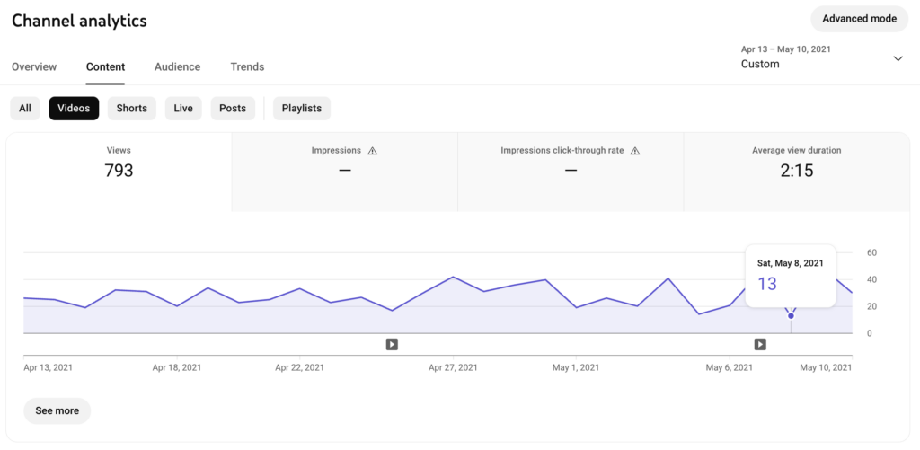 - Top playlists. These are your most popular playlists. In the Advanced mode, you can check the number of views, average view duration, and watch time for each playlist.