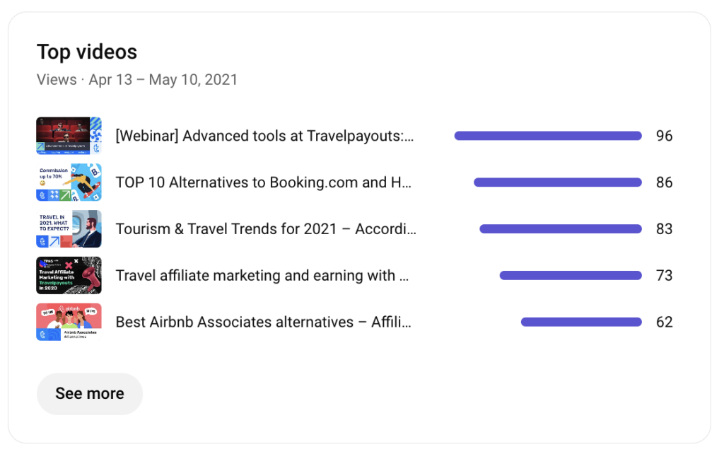 - Top videos. These are your most-watched videos over the selected time range.