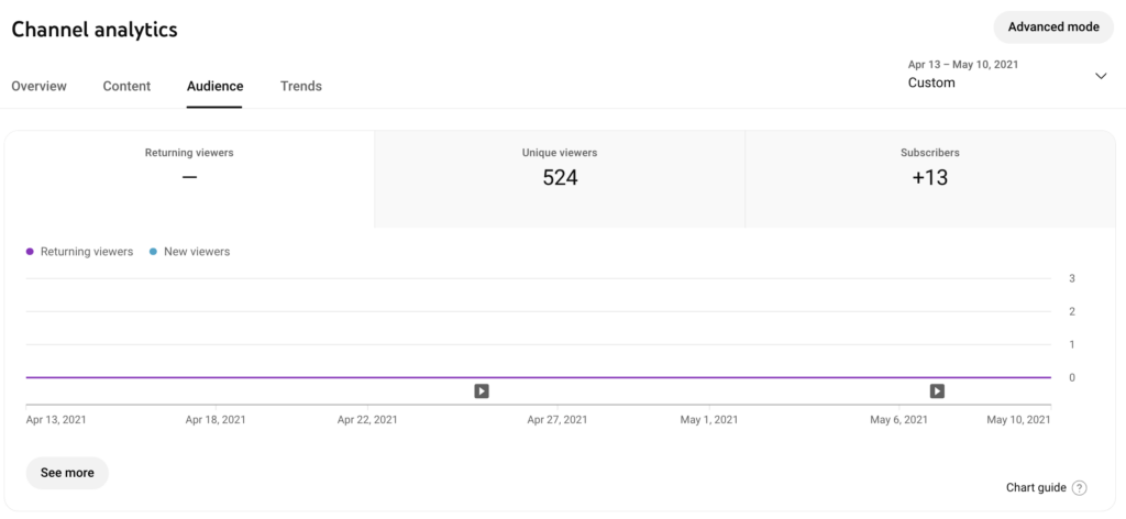 - Returning and new viewers. The chart shows the number of returning visitors who have already watched your channel, as well as the number of new visitors for the selected time period. The last category also includes users who watch videos from private browsers, delete their watch history or come back to your channel after a year.