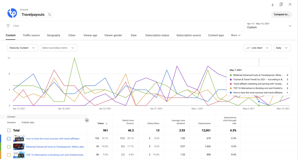 In the example below, YouTube search is the largest source of traffic, so it makes sense to consistently optimize video titles, descriptions and meta tags for SEO. External traffic is much lower, but checking which websites have shared the channel’s content may give valuable insights and new partnership ideas.