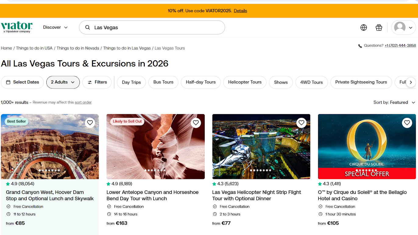 In addition, Viator also offers skip-the-line tickets and passes to popular landmarks as well as travel and transportation services, such as bus tours and day trips. On the website, travelers can easily filter activities by type, price, duration, time of day, rating, special offers, and more.