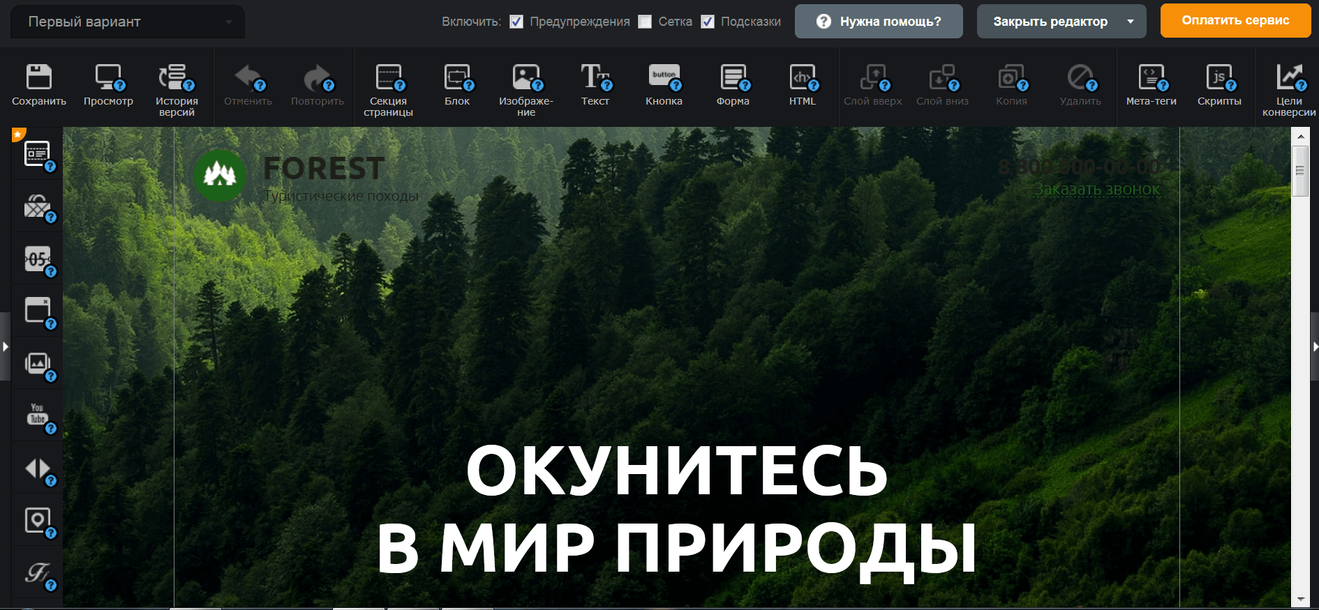 Сервис предназначен только для разработки лендингов. Известен в сетевом пространстве благодаря инструментам для автоматизации продаж и аналитическим модулям. У LPgenerator современный и лаконичный дизайн панели управления. Возможности В визуальном редакторе кроме базовых инструментов: управление блоками, добавление изображений, интеграция кнопок и форм, есть и более интересные: слайдер отзывов, карта проезда, дополнительные шрифты, цели конверсии.