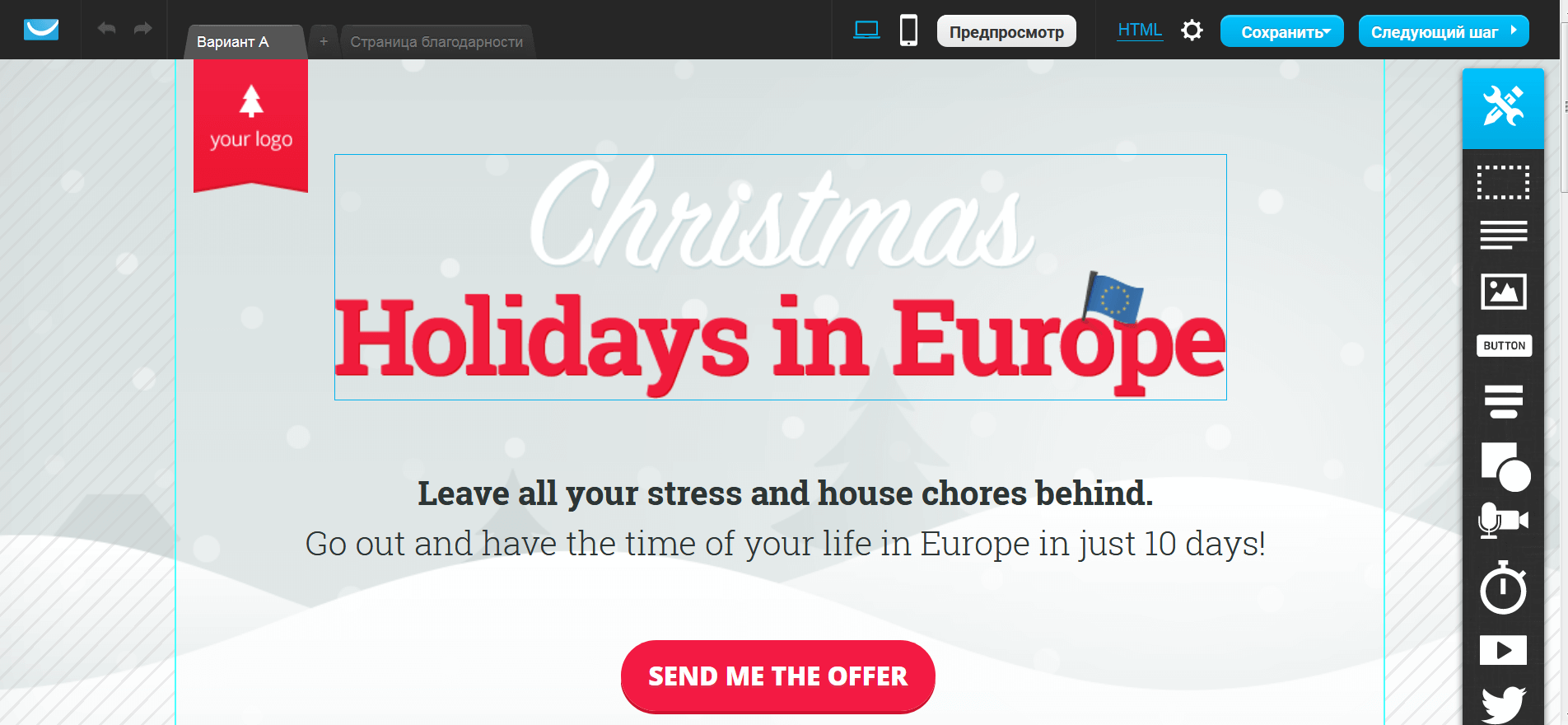 Сервис Getresponse предлагает широкий набор инструментов для продвижения онлайн бизнеса: рассылки, автоответчики, CRM и создание Landing Page. Для получения доступа к функционалу нужно заполнить анкету и подтвердить телефон. Возможности Редактор удобный, страницы добавляются через виртуальный браузер. Можно вставить: кнопку, форму, изображение, фигуру, видео, таймер обратного отсчёта.