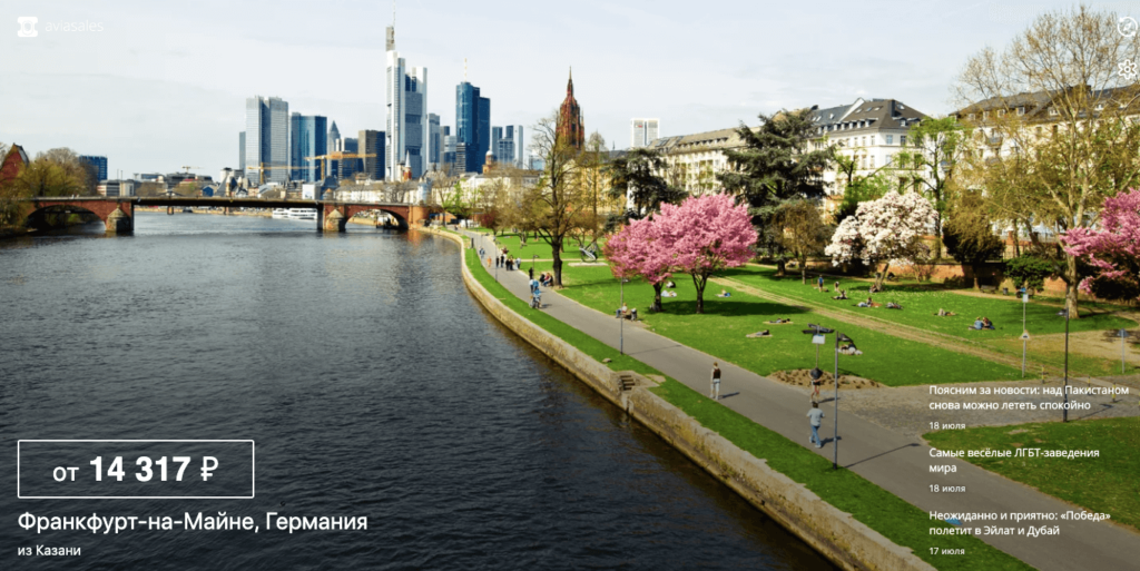 В правом нижнем углу экрана расположена лента статей блога Aviasales, а для некоторых городов появляются отзывы путешественников.