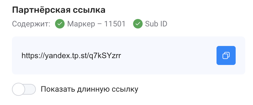 - Скопируйте партнёрскую ссылку и вставьте её на страницы своего проекта. По умолчанию генератор сформирует короткую партнёрскую ссылку. Такие URL содержат ограниченное количество символов, что важно для работы с социальными сетями, название выбранного бренда, а ещё выглядят более трастовыми. Подробнее о преимуществах коротких партнёрских ссылок читайте в нашей статье. Если вам удобнее работать с длинными ссылками, нажмите переключатель «Показать длинную ссылку».