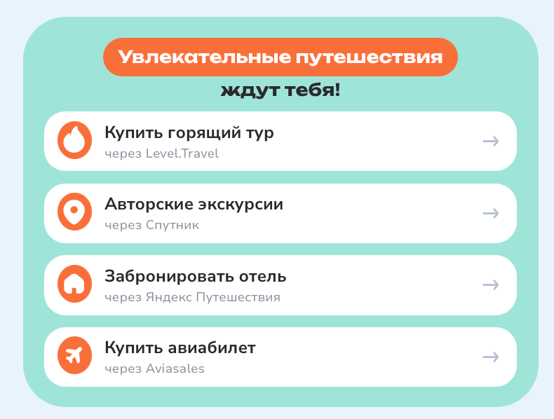 • Добавить ссылки на дополнительные туруслуги. Например, сим-карты от Yesim, туры от Travelata, аренду машин от Localrent.