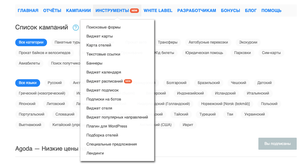 Hotellook. Его также нет в списке кампаний, вы можете начать работать с ним сразу после регистрации, а инструменты для работы можно найти в том же меню, где находятся инструменты Aviasales.
