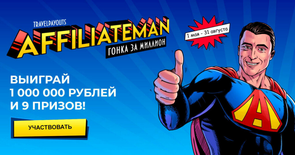 Даже если вы недавно зарегистрировались в Travelpayouts и только начали работать, вы всё равно можете выиграть призы от рекламодателей и даже миллион рублей. Горячий летний сезон каждому даёт шанс стать суперменом в мире партнёрского маркетинга.