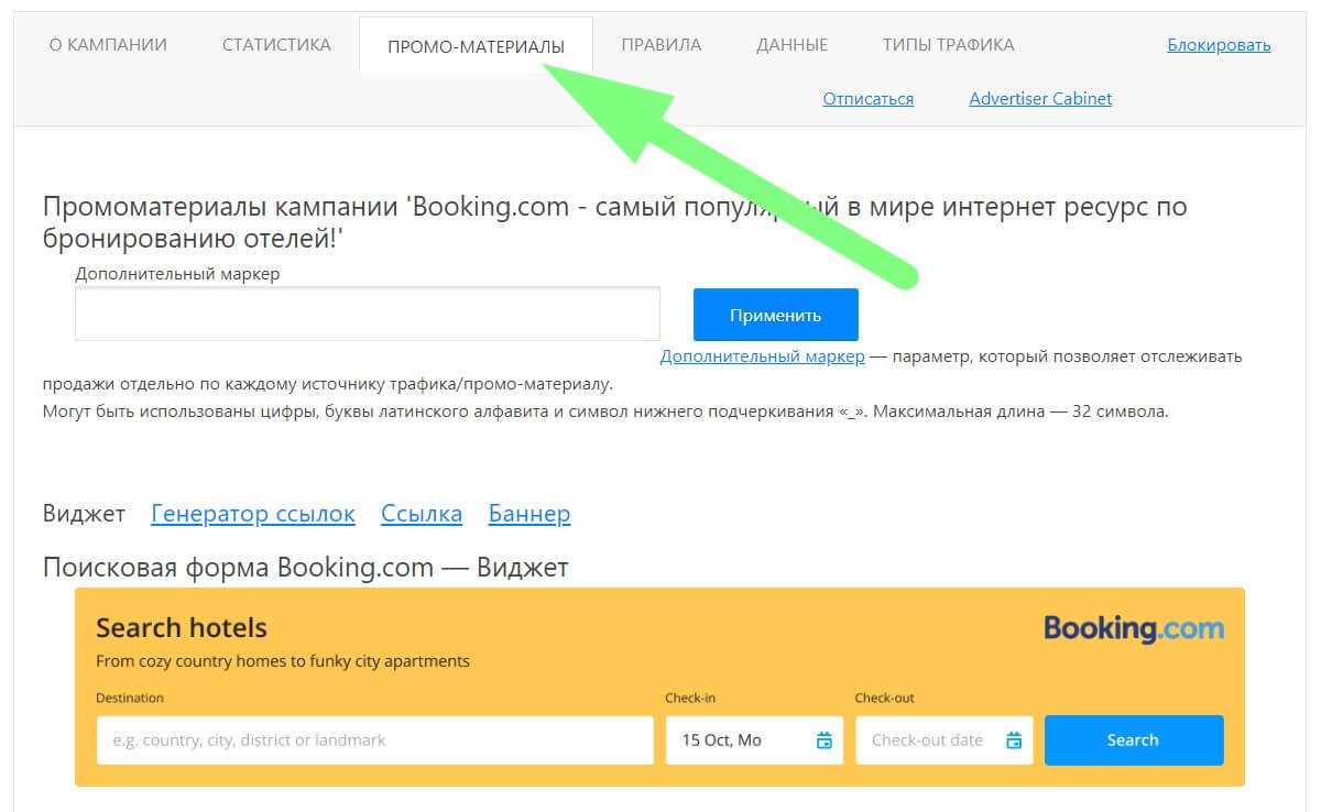 Инструменты всех остальных партнёрок расположены в разделе «Промо-материалы» на странице каждой отдельной партнёрской программы, например Booking.com: