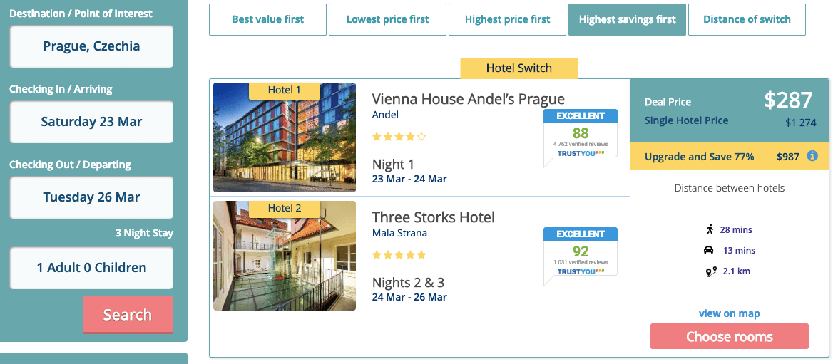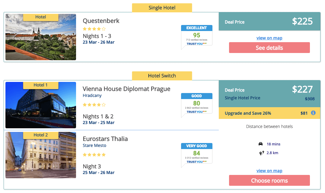 Возможность жить в отеле выше классом и лучше по отзывам С помощью Nightly.travel можно искать и отели, свободные на всё время вашего проживания. Они появятся в общем списке, и вы сможете сравнить стоимость проживания в одном отеле и стоимость проживания с переездом. Например, примерно за одинаковую стоимость можно пожить 3 ночи в отеле 4* или две ночи в отеле 4* и одну ночь в отеле 5* в самом центре Праги.