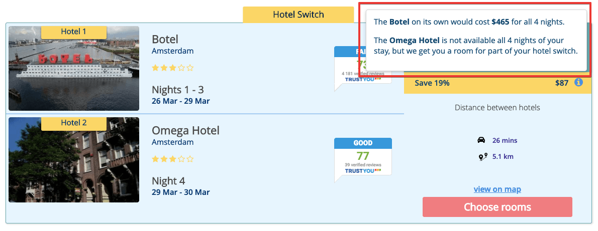 Допустим, вы решили поехать в Берлин на 3 ночи и хотите забронировать отель 4* с хорошими отзывами. Нашли отличный отель, подходящий по цене, но он свободен только на одну ночь в рамках времени путешествия. В таком случае обычно выбирают другой отель, свободный на 3 ночи, но он может быть дороже или хуже по качеству. С Nightly.travel можно скомбинировать два отеля: провести одну ночь в первом и оставшиеся две — во втором. Алгоритм сервиса подбирает отели, ориентируясь не только на время проживания, но и на другие запросы: класс отелей, удалённость от какого-либо места на карте, отзывы, общий чек за всё время проживания. Собрав все данные, алгоритм Nightly.travel находит в базе из 75 000 отеле самые недорогие варианты, которые соответствуют заданным параметрам. Также Nightly.travel может предложить вам переезд, если в первом отеле стоимость номера вырастет к концу срока проживания. Например, вы планируете потратить 400 долларов за 4 ночи в Амстердаме, то есть по 100 долларов в сутки. Но в реальности первые две ночи в одном и том же отеле могут стоить почти в два раз меньше, чем две оставшиеся, из-за повышенного спроса на эти дни.