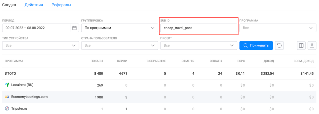 Например, используйте cheap_travel_post для статей о бюджетных путешествиях или greece_summer_post для статей о поездках в Грецию. Затем отслеживайте данные по SubID на вкладке «Статистика» в аккаунте Travelpayouts.