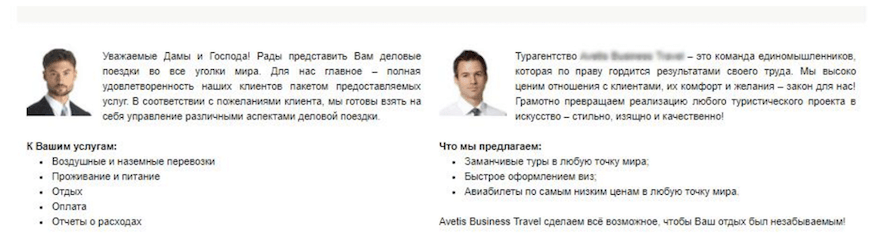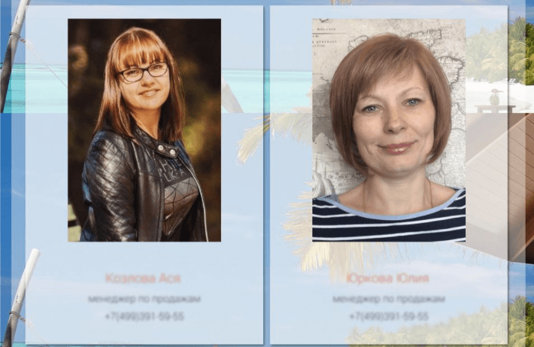 • «Очеловечили» сайт — добавили фотографии реальных сотрудников с должностями. Теперь каждый пользователь, посетивший сайт, начинает знакомство с турфирмой задолго до того, как перешагнет ее порог.Для того, чтобы Вы понимали, что изменилось, предлагаем посмотреть варианты, которые делаются на скорую руку и те, что призваны работать на продажи. Оговорюсь сразу, что приведенные примеры не касаются конкретно нашего клиента, так как он пожелал остаться инкогнито.Формальный подход: Живая команда: