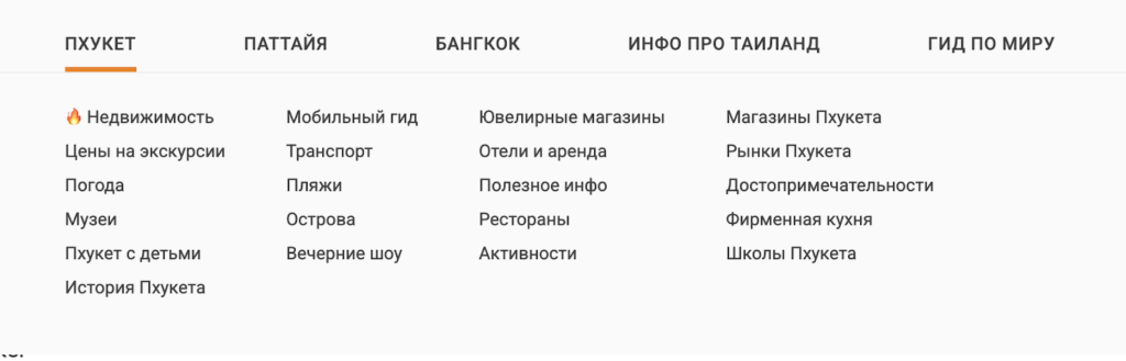 | Рубрики и категории спрятаны в выпадающем меню. | Чем проще навигация, тем лучше поведенческие метрики. | Вынести рубрики на главную в отдельные блоки: – По городам: Пхукет, Бангкок, Паттайя. – По темам: еда, отдых с детьми, куда пойти. |