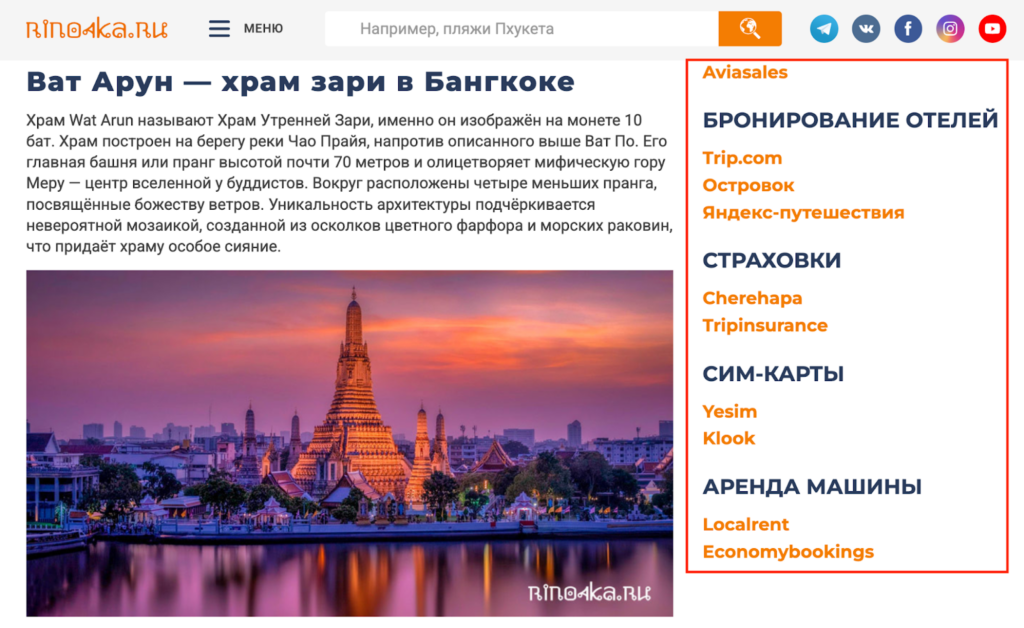- Обернуть упоминания отелей, названий мест и фраз вроде «отели Пхукета» в партнёрские ссылки — так они будут работать и в тексте.
