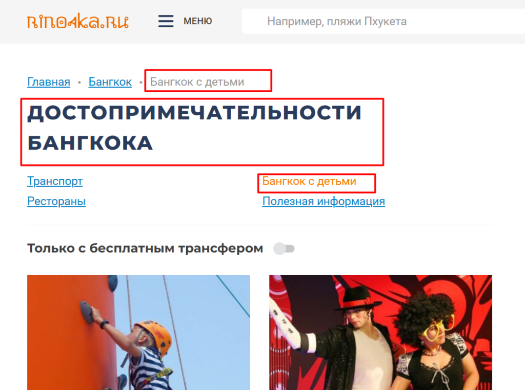 | H1 не соответствует содержанию рубрики. | Заголовок вводит поисковик и читателя в заблуждение. | Заменить H1 на релевантный. Например, на странице «Бангкок с детьми» указан H1 «Достопримечательности Бангкока». Это не отражает тематику раздела. Этот заголовок можно заменить на «Что посмотреть/чем заняться/куда сходить в Бангкоке с детьми». |