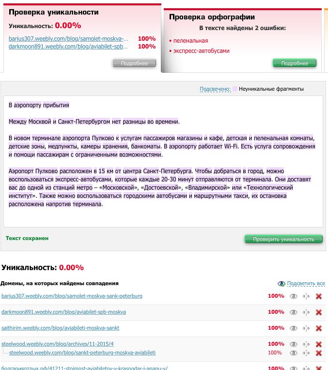 Вот что бывает, если проверить в text.ru неуникальный текст. Текст взят с сайта наших конкурентов. Высокий уровень совпадений объясняется тем, что контент генерируется автоматически.