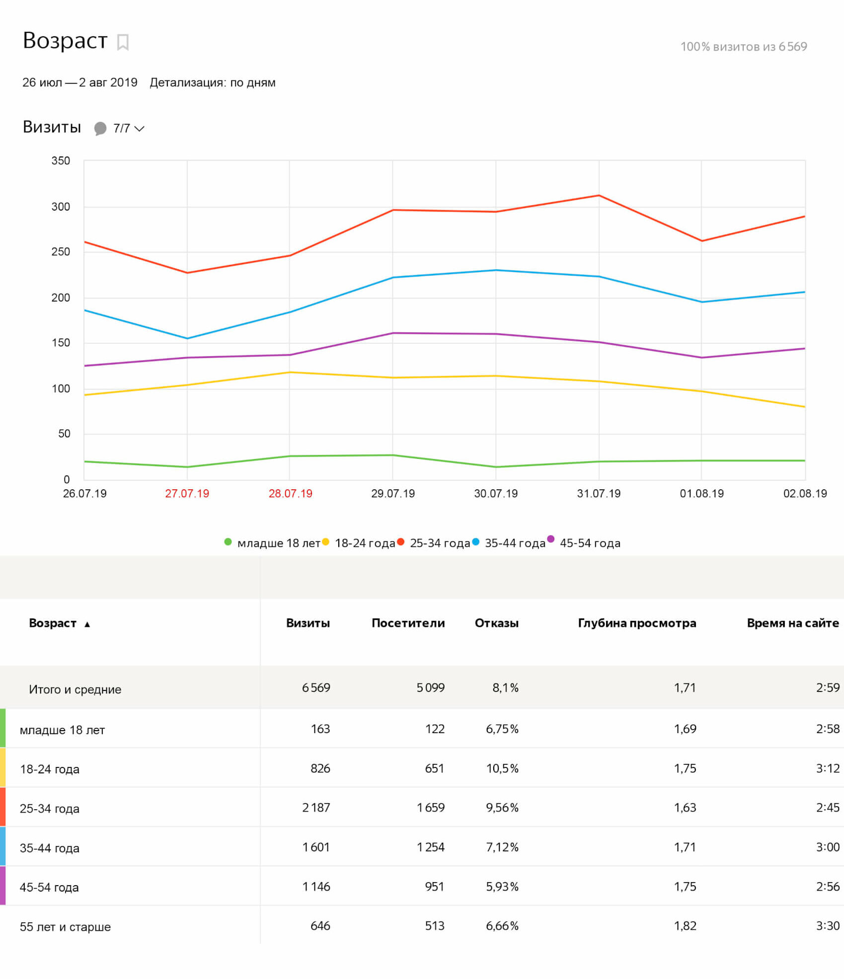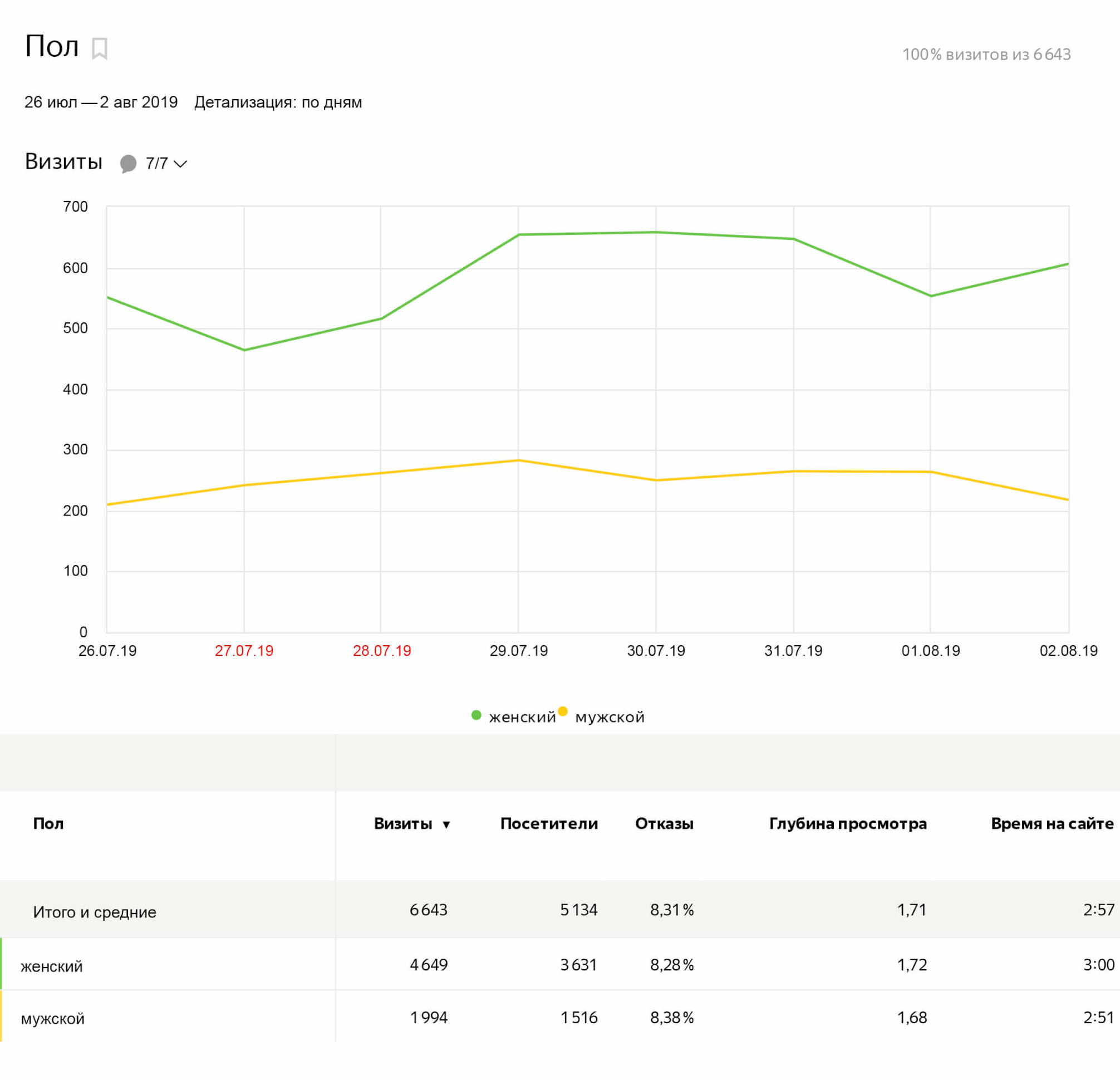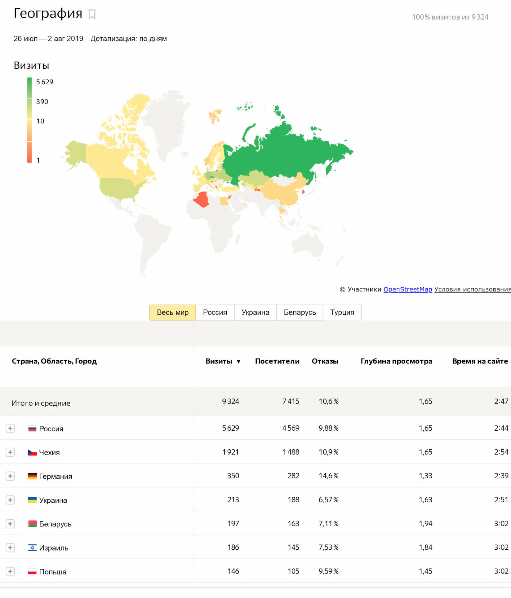 В сутки на сайте приходит 1 000-1 200 посетителей. Далее на скриншотах из Яндекс.Метрики можно посмотреть данные по географии, полу и возрасту посетителей.