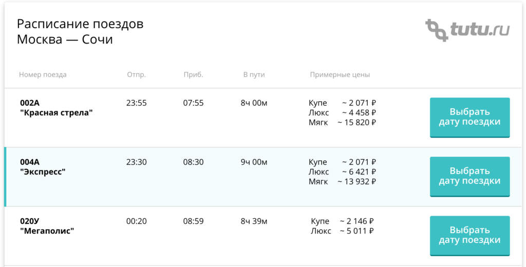 Вы можете задать конкретное направление, и виджет отобразит все доступные поезда и примерные цены. Чтобы получить точную информацию, посетителю останется выбрать лишь дату поездки.