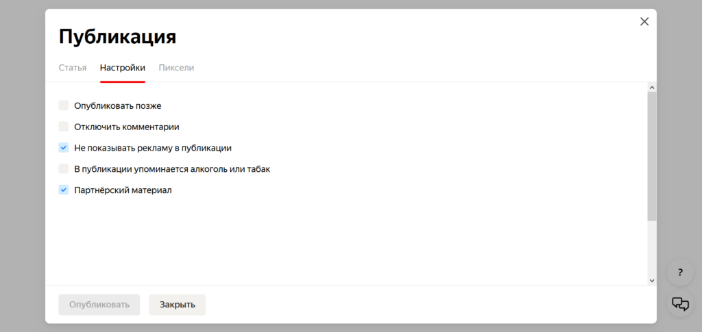 - Публикации. Доступ к черновикам, отложенным и опубликованным материалам.
